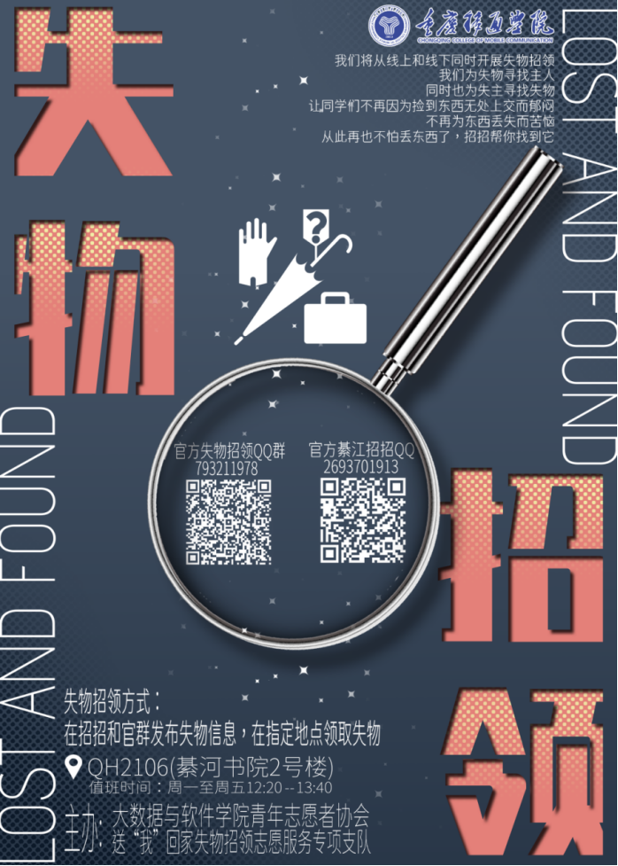 秉持着服务同学的初心,在周一到周五的中午,25名失物招领支队的成员都恪尽职守,牺牲午休时间,轮流来到綦河书院QH2106值班点,悉心整理遗失物品,用标签贴好物品信息,并在工作表上做好记录,由当日值班的成员在失物招领群和“招招”官方QQ发布信息,耐心等待失主前来认领物品。