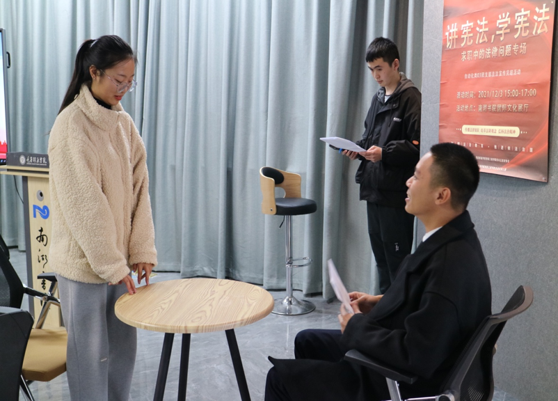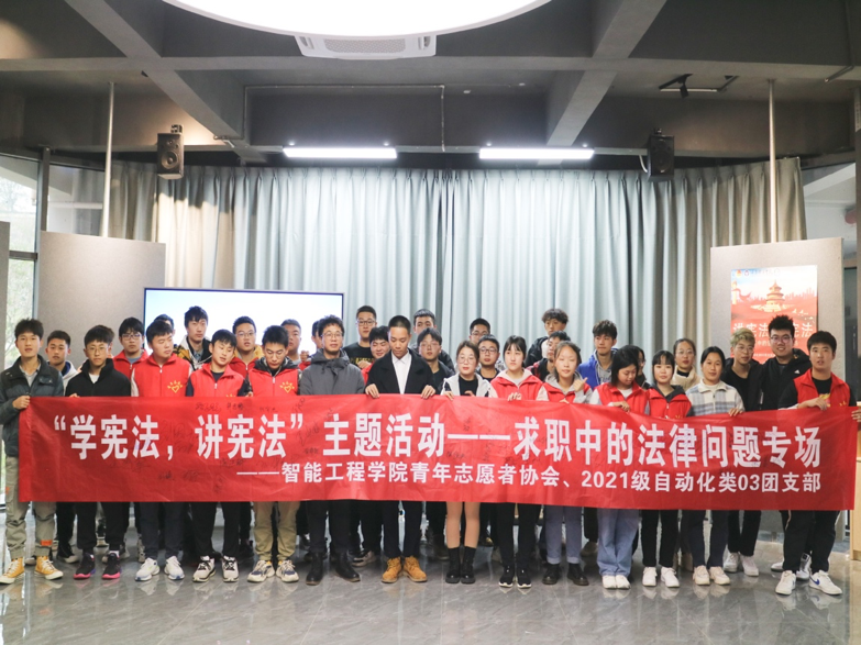 2021年12月4日下午,智能工程学院青年志愿者协会联同智能工程学院自动化类三班在南湖书院国际文化展厅举办了“学宪法,讲宪法”主题活动——求职中的法律问题。一次志愿服务活动将志愿者和自动化类三班的同学们紧紧联系在一起。