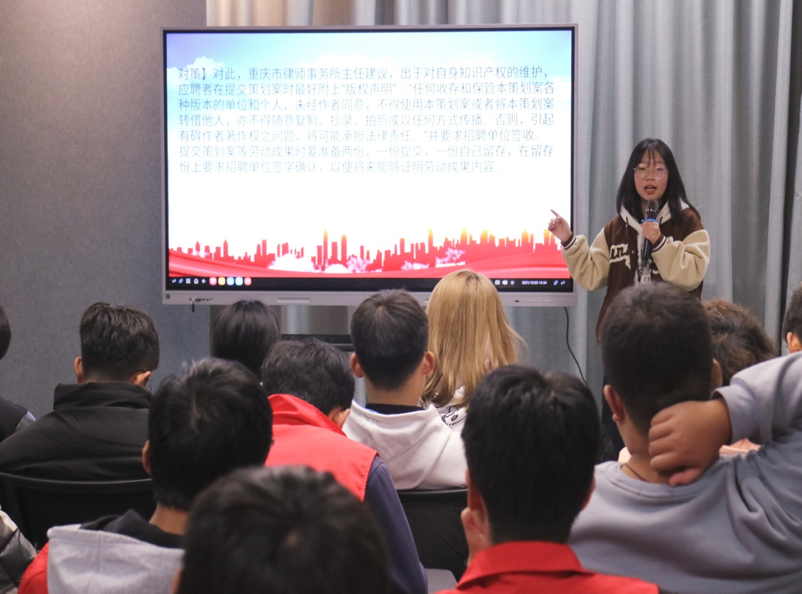 在同学们对求职中的问题有初步的了解后,智能工程学院青年志愿者协会主席刘岚洁为同学们进行了求职中的违法事件案列分析。这些案例包含了多种常见的求职陷阱,比如虚假广告陷阱、色情陷阱、传销陷阱协议陷阱等。通过一个个鲜活的案例,为同学们讲解具体的解决方式,只有将法律知识牢牢掌握,才能确保求职的法律安全。