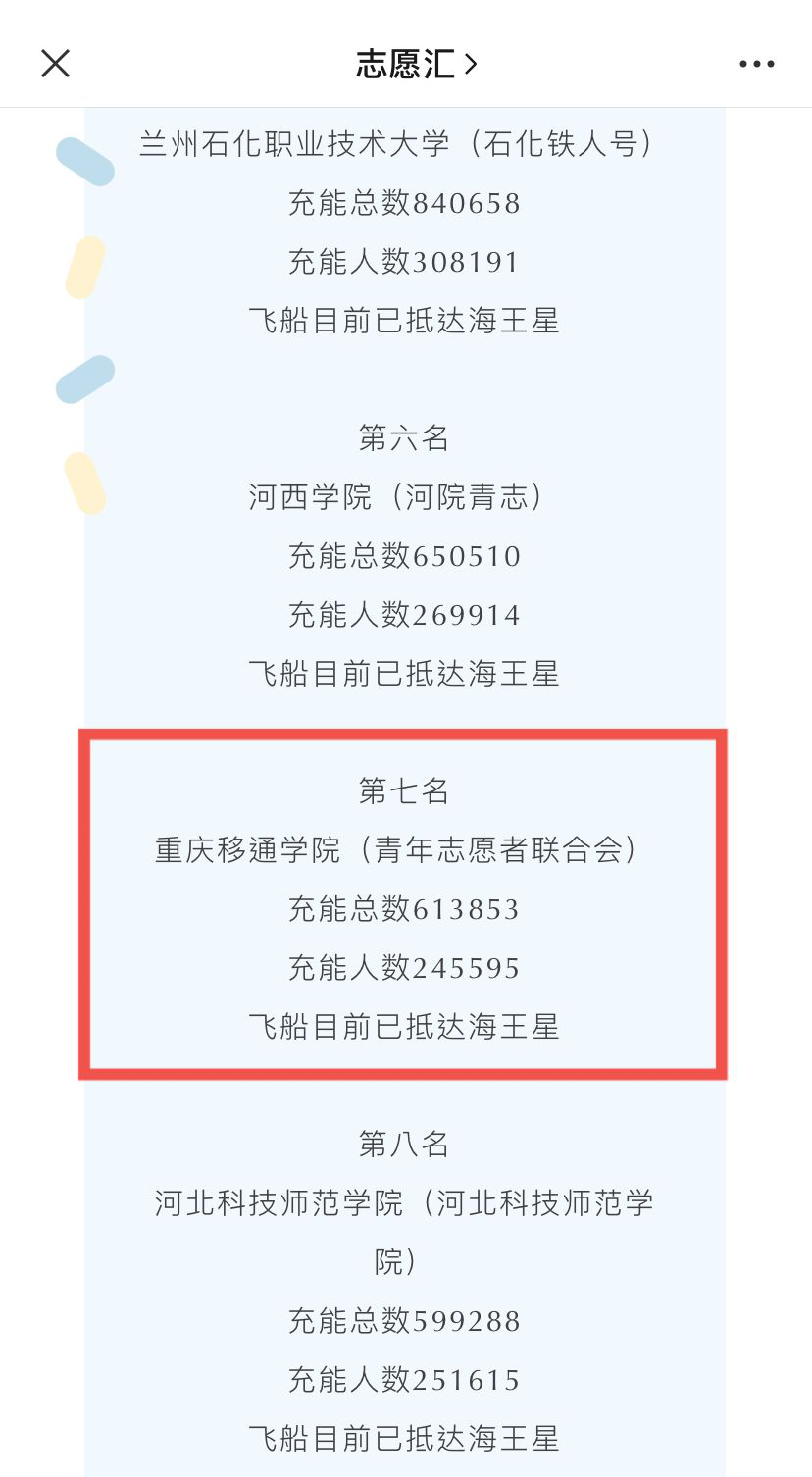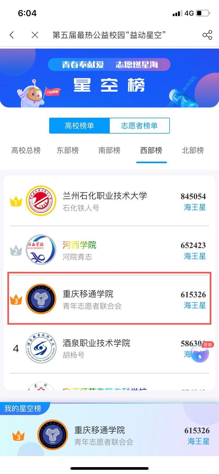 同时,在活动开展期间,志愿汇第五届最热公益校园“益动星空”开启高校宇宙飞船号,邀请脚踏实地参与志愿服务的高校青年学生志愿者们一起仰望星空。我校各年级各班团支队每日登录获得航天能量,并答题看视频努力赚取能量充能我校宇宙飞船,助力遨游太空,让高校志愿服务点燃星辰大海。在进行一个多月的活动后,最终我校移通青年志愿者联合会飞船号荣获高校榜第七名,西部地区第三名的好成绩,展示了我校青年学生的风采,进一步营造了良好的志愿服务氛围。