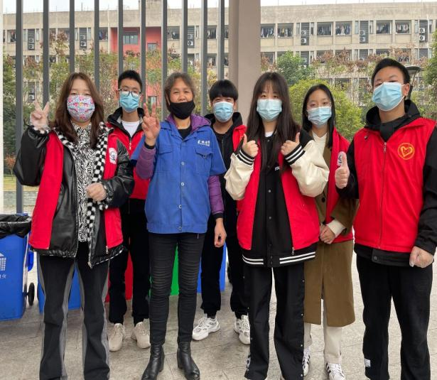 (图为数字经济与信息管理学院2021级05团支部,开展”垃圾分分类,一点也不累”环境保护活动,志愿者们与环卫叔叔阿姨们进行详细的垃圾分类)
