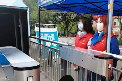 (图为大数据与软件学院2021级02132114团支部,开展“情诗系予移通·摄影送与志愿”活动,志愿者在校门口执勤)