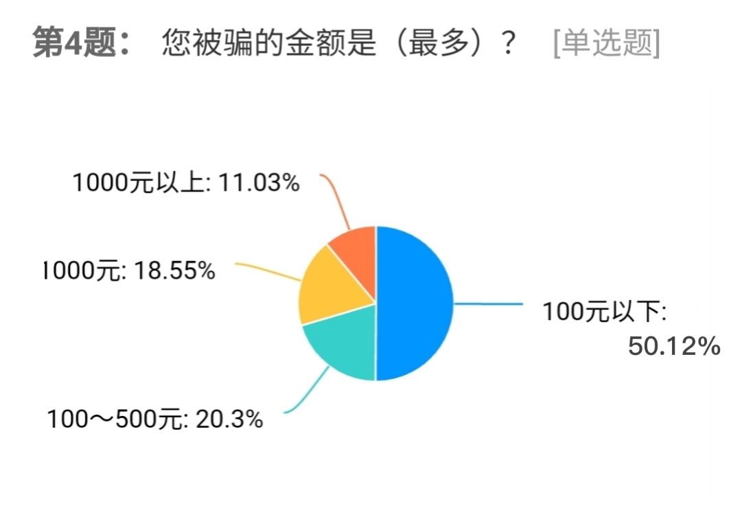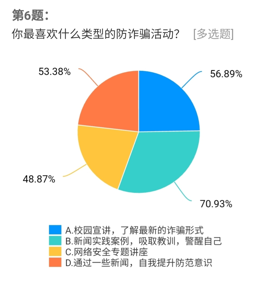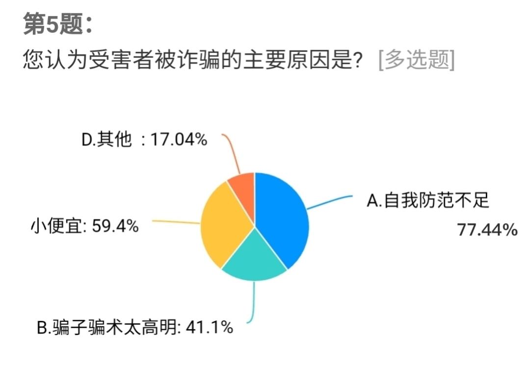 现场志愿者将准备好的神秘礼物“诈骗盲盒”发放给现场的每一个居民。盲盒上印刷了诈骗测试题,居民们答对后,打开盲盒即可获得一份惊喜小礼品,随后志愿者向居民们讲解了诈骗背后的真面目并邀请他们填写调查问卷。居民们踊跃参与,纷纷给出了自己的答卷,77.44%的居民表示被骗的原因是自我防范意识不足,被骗的金额一般是在百元以内,只会选择向自己的亲朋好友诉说,希望能够多开展防诈骗宣传活动,让自己能够真正的了解诈骗,远离诈骗。