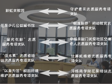 为整合支队资源,各类支队都能结对帮扶,让优秀支队以“老”带“新”,以“优”带“新”,优势互补,互鉴学习,会议中彩虹支教团与守护青禾志愿服务专项支队“结对”、花果少儿公益图书馆与“朝逢新芽”劳动教育志愿服务专项支队“结对”等,不仅缩短支队间的“地缘距离”,还拉进支队间的“心理距离”,不断提高支队整体的志愿服务精准化程度、专业化水平。