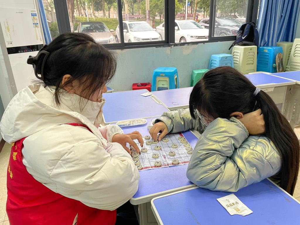 在志愿者们的心里,对小朋友们的关爱和帮助已经成为了日常生活中不可缺少的一部分,小朋友们也把“红马甲”当成能够依赖的对象。为了传承中国象棋这一传统文化,通过“棋”文化教育,开发小朋友的心智潜能,培养小朋友良好的心理素质,志愿者在教室陪着小朋友下象棋,让小朋友们懂得“象棋似战争,走子如布阵,河界三分阔,智谋万丈深”的道理。