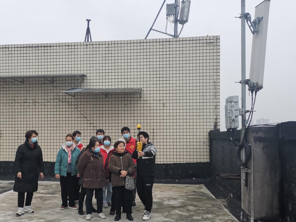 中国电信合川分公司讲解员徐集勇带领志愿者和南津街道的居民们来到中国电信合川分公司大楼楼顶,开启了本次的参观之旅。为加深同学和居民们对辐射知识的了解,讲解员徐集勇带领大家测量信号基站的辐射度数,根据国家标准方法,在基站围墙外5米进行测量,但在如此近距离内测量值都小于标准限值,让志愿者们和居民深刻了解到基站构不成对人体的辐射。
