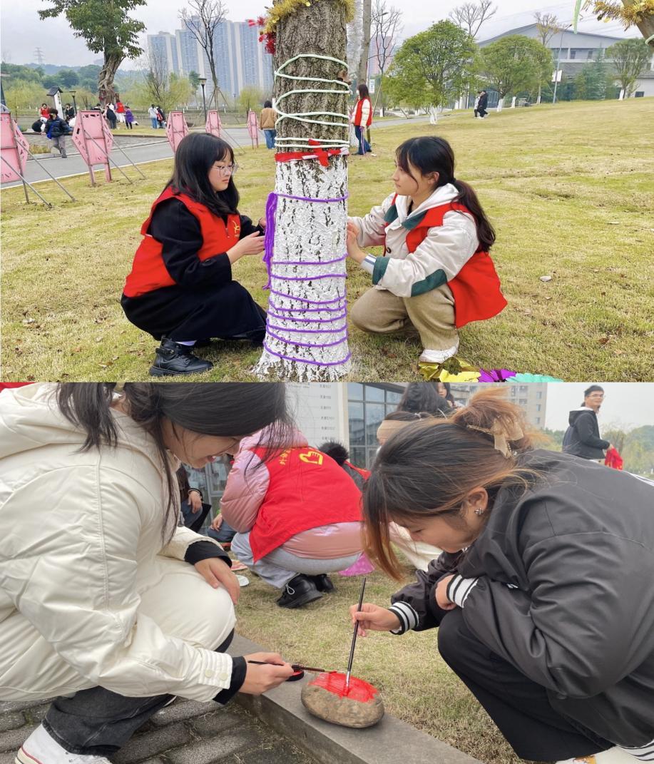 为树刷白的活动暂时落下帷幕,紧接着便是点缀树木。志愿者们充分开动自己的脑筋,发挥自己的想象与创意,将每棵树装饰出不一样的味道。大家细心地将准备好的装饰品有序挂到树上,志愿者们两两一组,一人准备材料,一人来装饰,这样搭配干活既提高了效率又锻炼了合作能力。为大树装饰使校园充满了活力与温暖,同时也拉进了人与人之间的距离。除此之外志愿者们还可以用鹅卵石画画,充分展示创新与绘画技术。在绘画过程中,可以看到一块普普通通的鹅卵石在志愿者的手上大放光彩,它们被点缀成了各式各样的艺术品。