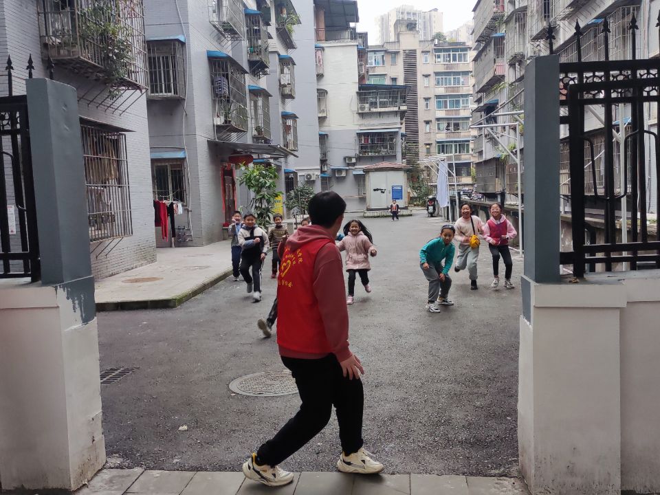 志愿者们与小朋友一起携手来到室外空旷处,小朋友们提议玩游戏,志愿者们也很乐意和小朋友们一起玩耍。小朋友提出玩一二三木头人,志愿者们对此非常感兴趣,纷纷加入了他们。游戏一开始,小孩子们滑稽的动作便让整个小区充满了笑声,志愿者们的落落大方,更加展现了他们的活力与童真。之后又玩了老鹰抓小鸡的游戏,由一位男志愿者当鸡妈妈,一位活泼的小朋友当老鹰,其余小朋友和志愿者纷纷当选小鸡。游戏一开始,“老鹰”便迅速扑向小鸡们,“鸡妈妈”奋力保护着“小鸡们”,欢笑声在游戏中传出,也在志愿者们心中流淌。