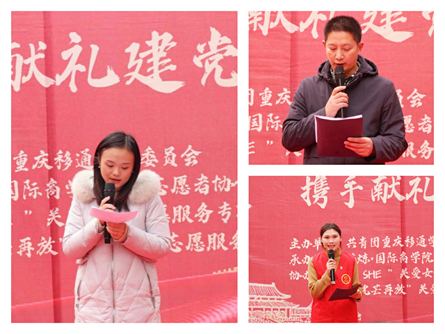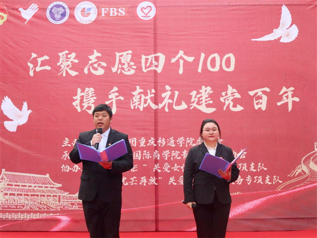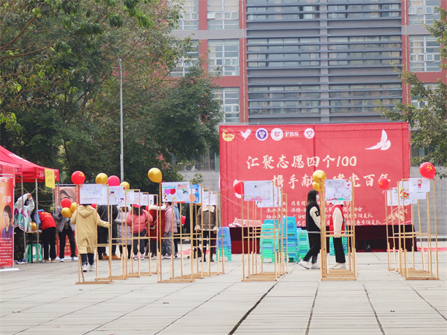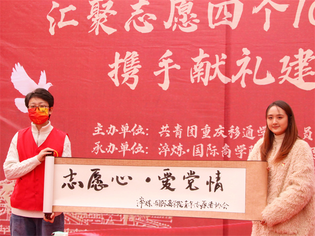 2021年12月19日,淬炼·国际商学院青年志愿者协会“汇聚志愿四个100,携手献礼建党百年”主题巡展在合川校区黄桷树广场、綦江校区綦河书院展开。本次活动旨在以巡展的形式汇集志愿“四个100”系列作品,向中国共产党百年华诞献礼。重庆市革命伤残军人康复医院副院长李卓翰、社工科科长朱永红,淬炼·国际商学院学工副院长刘薇唯、团总支书记黄新燕,校院两级志愿服务指导老师、社团活动指导老师,各学院党员代表、基层班团志愿者代表等共计600余人参加了本次活动。