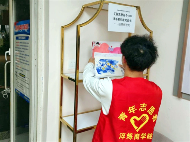 第四站,手绘百年路,传颂正能量。书法和绘画是传达情感最为直观的方式,又是众多小朋友的兴趣所在。于是,淬炼青协向各志愿服务活动基地发出邀请,邀请一经发出,就吸引众多小朋友参加。他们之中有黑岩社区卓尔小学的学生,也有花滩社区和太平门社区的小朋友。此外,双校区志愿服务班团支队学生代表、党员代表也参与了创作。他们以建党百年、抗击疫情和红色志愿为主题,一幅幅手抄报、绘画和书法作品展现了满满的正能量。
