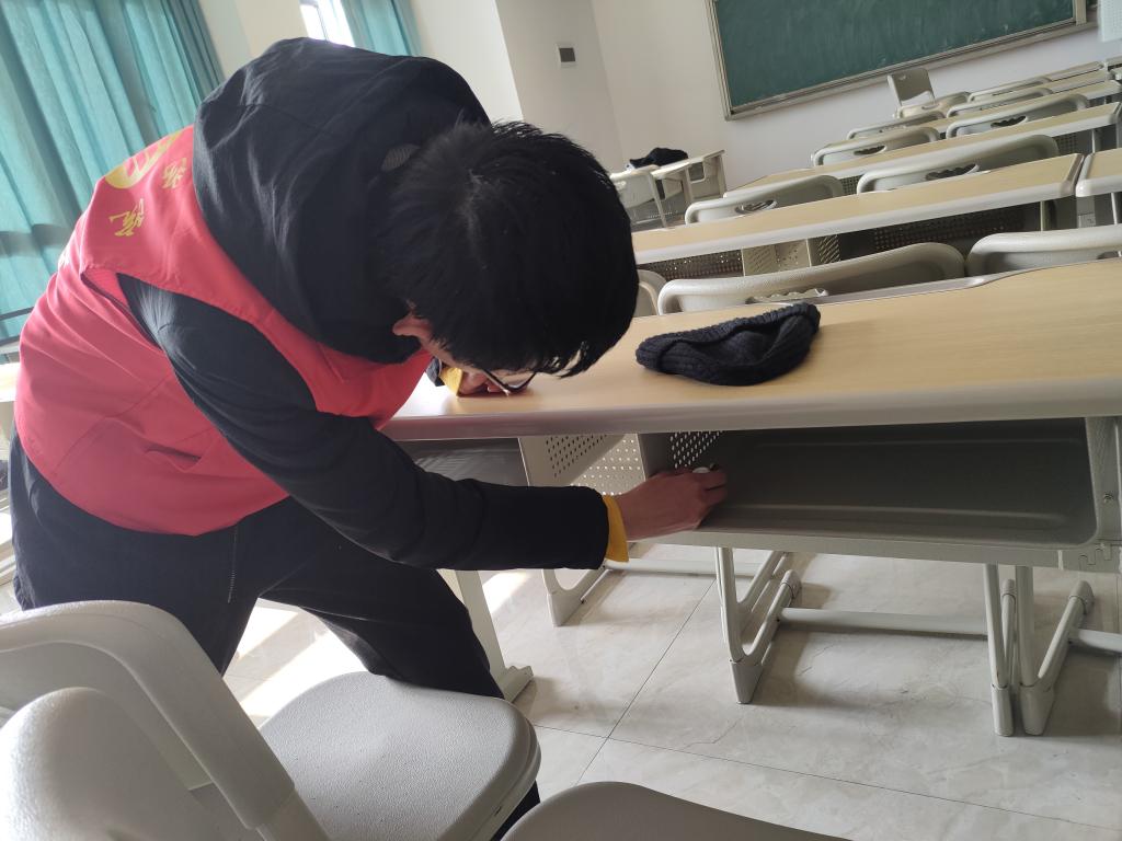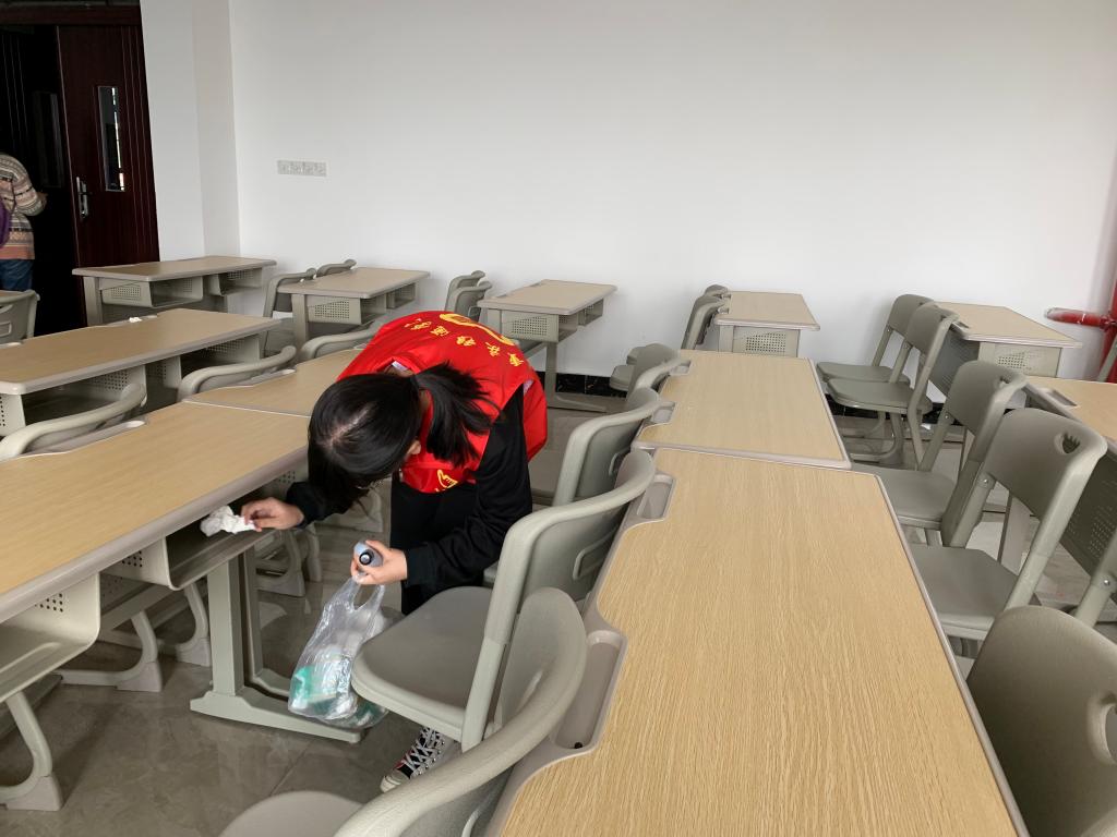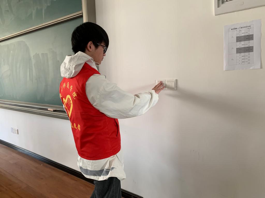 为营造干净整洁的学习环境,给老师和同学们创造良好的学习氛围,志愿者们分工明确,自主分成两个队伍,分别从南、北两面进入教室开始工作。到达教室后,志愿者们逐步开始检查是否有未熄灭的日光灯、课桌内是否有残留的垃圾以及黑板是否擦干净。在关灯和收拾垃圾的同时,志愿者们还特地留意是否有同学们上课后遗留下的物品。在活动过程中,志愿者们看见一名在教室享用午餐的同学,当看着志愿者们对教室进行垃圾清理,这位同学也跟随着志愿者将垃圾扔进垃圾桶里,为教室留下整洁的环境。