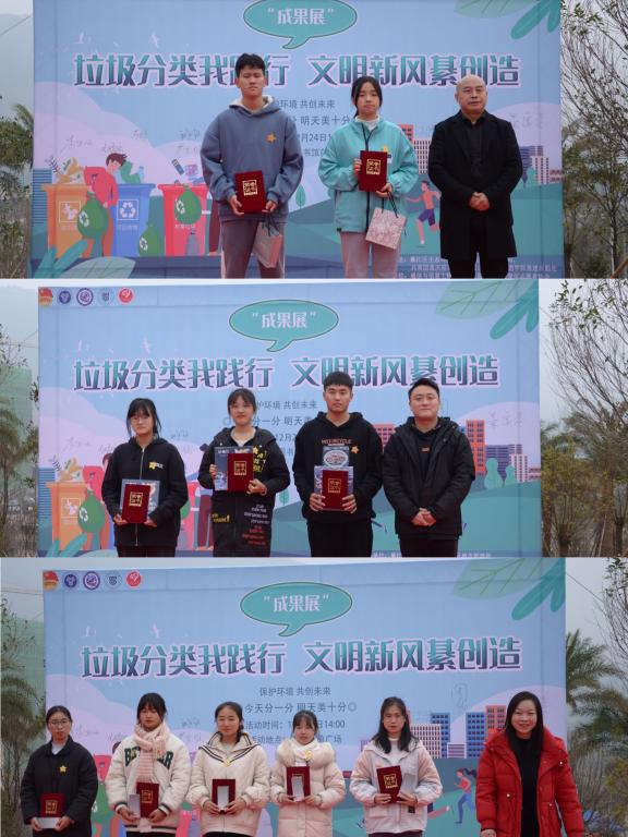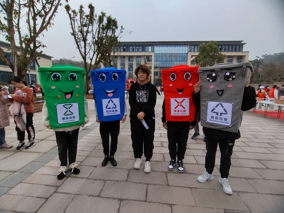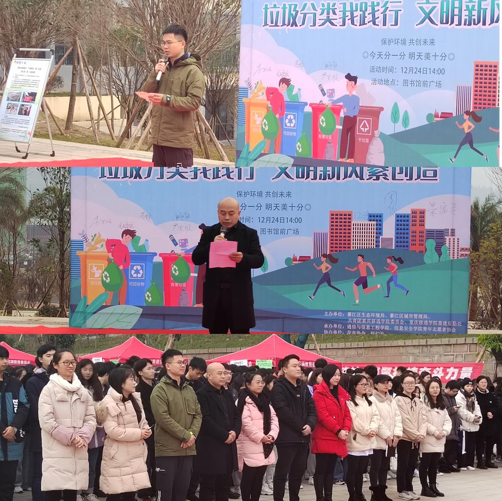 为全面提升在校大学生的垃圾分类意识,同时响应綦江文明城区建设以及为创全国文明卫生城市作贡献,从而形成一种“环保为人人,人人为环保”的良好校园氛围。由綦江区生态环境局、綦江区城市管理局、共青团重庆移通学院委员会、基建后勤处主办,通信与信息工程学院、信息安全学院青年志愿者协会承办,花卉协会、科幻社协办的“垃圾分类我践行 文明新风‘綦’创造”系列活动成果展于12月24日14:00在图书馆广场隆重举行。本次活动邀请到了綦江区生态环境局王婷婷科长,綦江区城市管理局景富贵科长,校团委副书记蔡星宇老师,基建后勤处江蓉老师,大数据与软件学院学工办主任阙小梅老师,淬炼·国际商学院学工办主任尹金维老师,通信、信安学院学工办主任周俊老师,校团委李兴凤老师以及各学院辅导员作为本次活动的嘉宾。