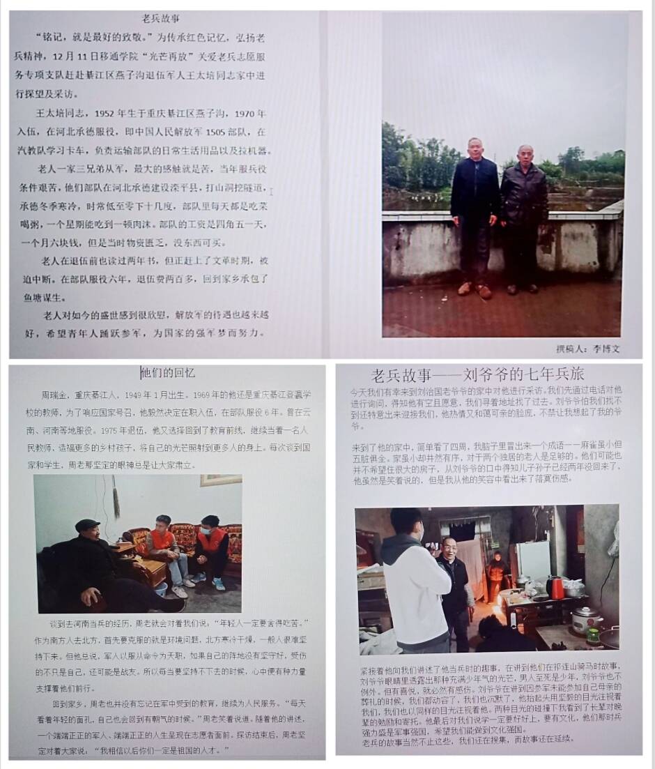 传承红色基因,追忆峥嵘岁月,老一辈革命战士不畏艰难险阻和不怕流血牺牲的革命精神是我们生生不息、代代相传的精神。为学习老一辈战斗精神,对老兵们心存感恩之心,为老兵们送上祝福和关爱,淬炼•国际商学院青年志愿者协会携手“光芒再放”关爱老兵志愿服务专项支队于2021年12月开展了一系列关爱老兵的特色活动。