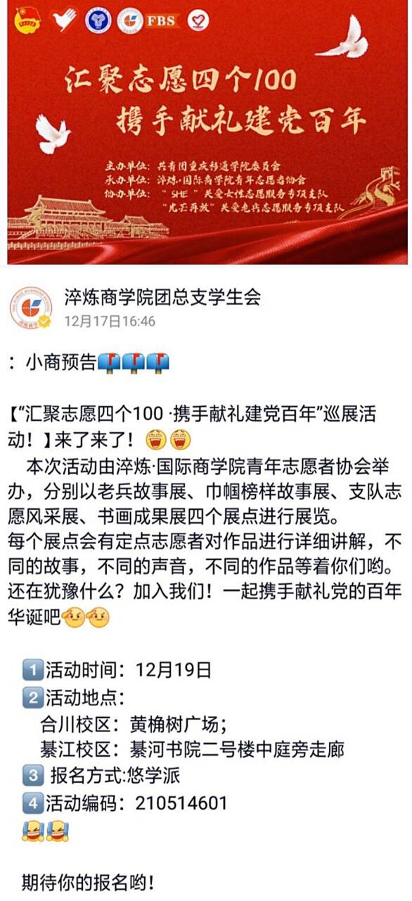 “一个有希望的民族不能没有英雄,一个有前途的国家不能没有先锋”。2021年12月9日—12月20日,“汇聚志愿四个100·携手献礼建党百年”十二月特色活动正式展开。该活动由淬炼•国际商学院青年志愿者协会携手“光芒再放”关爱老兵志愿服务专项支队以及“SHE”关爱女性志愿服务专项支队共同举办。为献礼建党百年华诞,呼吁当代青年担当起时代重任,本次活动以“四个一百系列”为主线,以文字、书法、绘画、音频、视频等多种形式征集老兵故事、巾帼故事、支队故事和手抄报故事,旨在让更多青年学子看见他们的伟大和崇高,看见以他们为代表的无比坚定的革命意志和不怕牺牲的大无畏精神,以及驰骋疆场、果断坚毅、一往无前的战斗精神。虽然老兵们已褪去军装,但他们会将军人的精神永远传递下去,滋润着青年的精神世界。在故事收集活动中,采取现场采访和网上查找两种方式,以Word文档的形式书写,将故事在活动中生动展现出来。