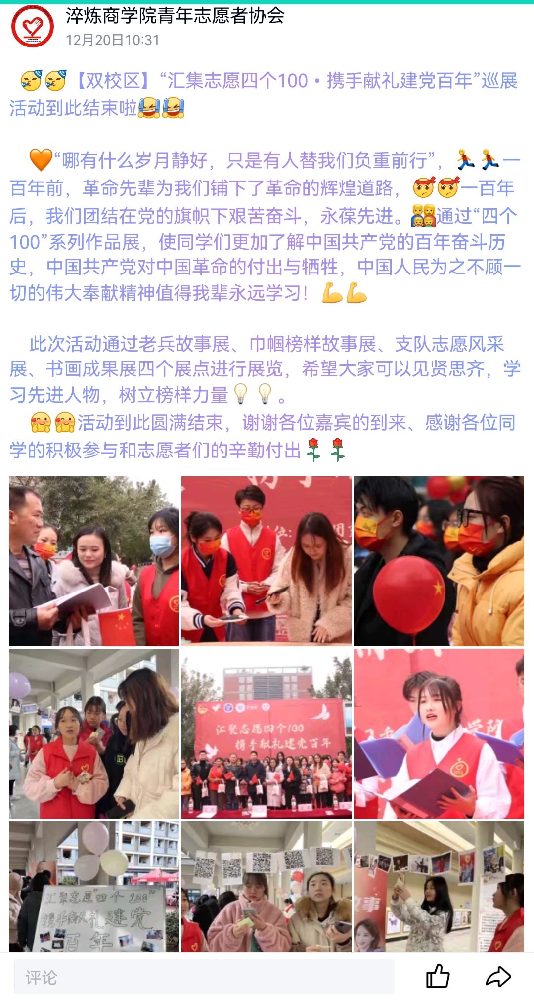2021年是建党一百周年,我们在今年开展了以四个一百为主线携手献礼建党百年活动。本活动以老兵故事、巾帼女性故事、我与支队的故事等四个系列展开,有助于让同学们在四个不同的板块感受祖国的磅礴伟力。百年历史历久弥新,百年风华波澜壮阔,自一叶红船启航,星星之火便足以燎原。通过本次四个一百活动,让同学们对党史有了更全面的了解,也让同学们更好的体验了志愿生活,在一次又一次的经历中成长发展自己。