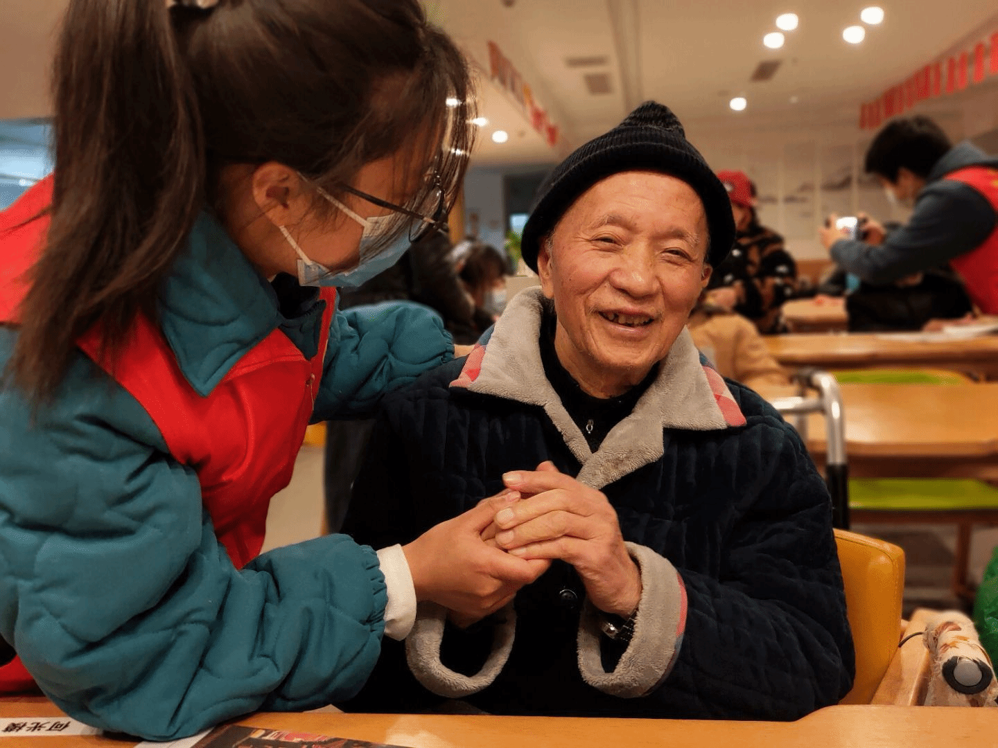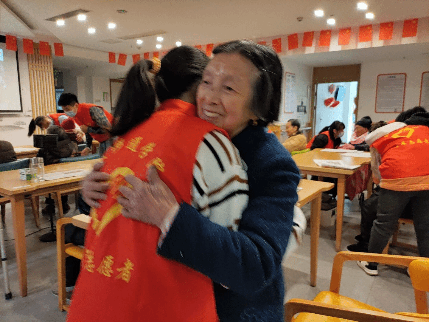 拥抱可以转递温暖和关爱,可以拉近老人和青年志愿者的距离,让老人感受温暖。在短暂的快乐后,活动已接近尾声。志愿者们与每一位老人深情拥抱,用拥抱将他们的关怀再一次传递给老人们,利用“爱的抱抱”为此次志愿服务活动画上完美的句号。
