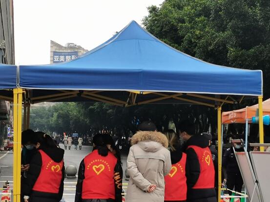 本次开学防疫工作是以一天十二个小时轮班轮岗的志愿服务形式。从晨曦初露到夜幕降临,行李消杀,扫码测温,出示健康码、行程码……。进校前,每位返校的同学都要在志愿者的引导下完成防疫流程,才能顺利进入校园。即使风雨交加、气温骤降,志愿者们依旧坚守在自己的岗位上,用心中那份坚定的责任感诠释着“奉献、友爱、互助、进步”的志愿服务精神。
