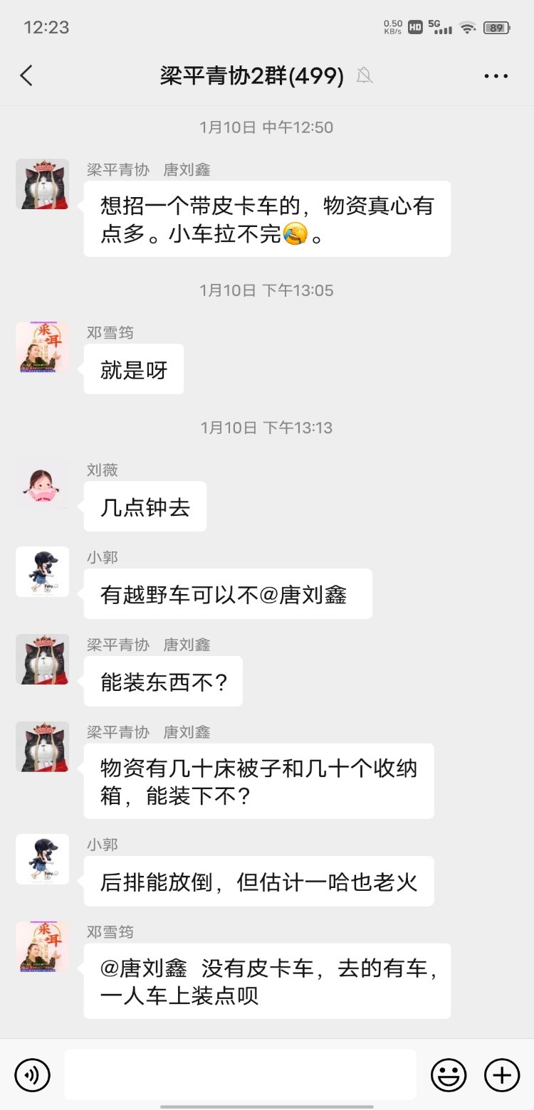 在志愿者协会涂小东的召集下,共募集志愿者五人,社会车辆三辆,其中小型货车一辆主要用于志愿物资的输送,其他两辆用于志愿者的出行。