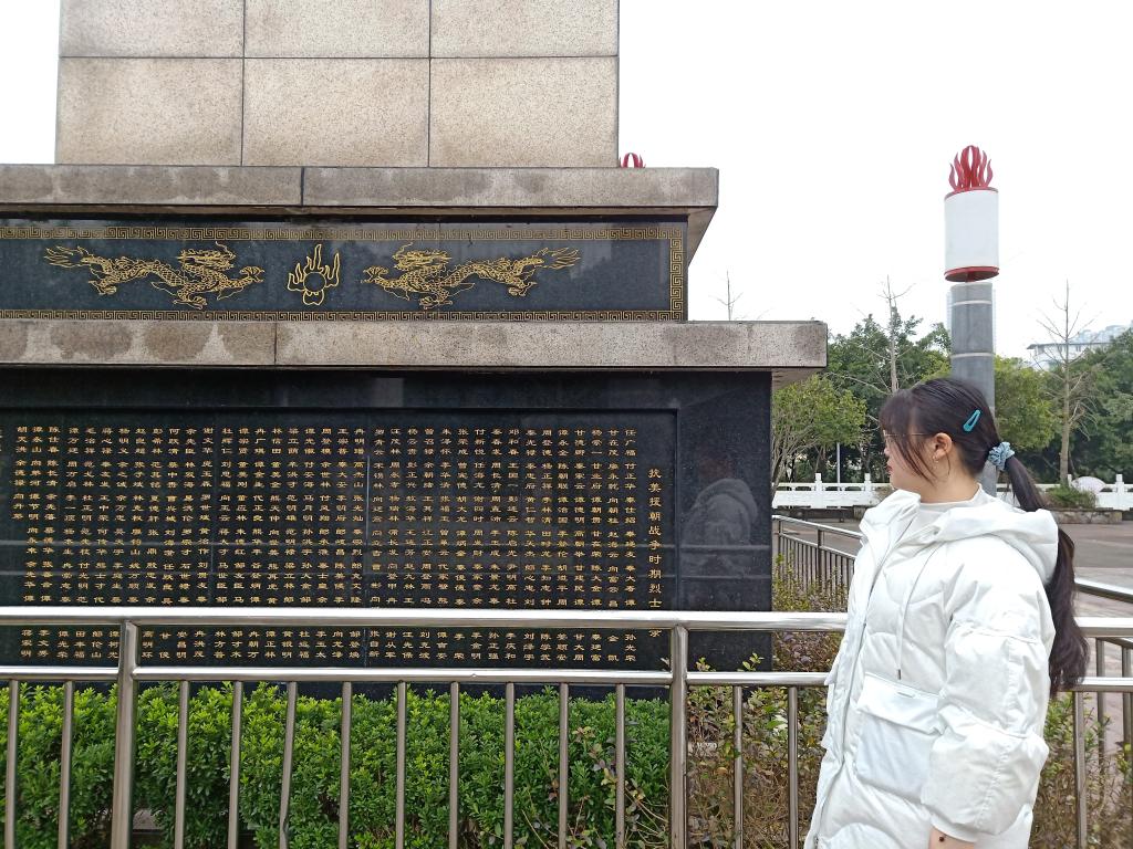 聆听抗战故事,重温革命历史。通信学院“除尘拾墨”的支队员还前往人民英雄纪念碑,高大的纪念碑耸立在广场上,纪念碑的正反两面分别书有“丰都县革命烈士纪念碑”和“人民英雄永垂不朽”等大字,两侧则是“革命烈士名录碑”,碑上刻有各个时期的烈士英名。纪念碑基座高3米,碑身高12.3米,其寓意是丰都1949年12月3日解放。一件件英勇的革命事件从志愿者的口中传入参观的旅客耳中,使旅客身临其境地感受到当年党和人民为保家卫国开展战争的历史场景,铭记历史,传承红色基因。