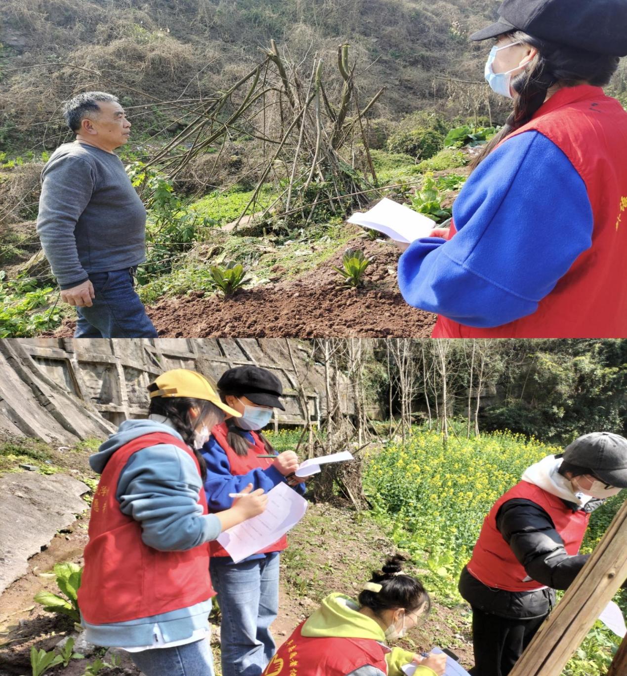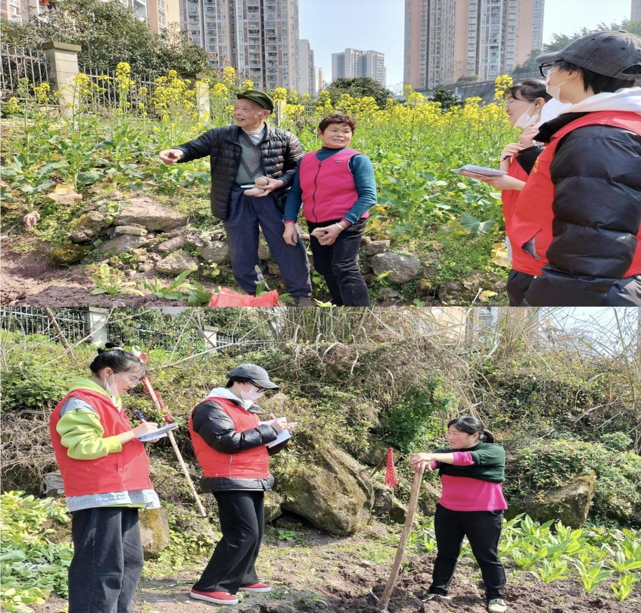 志愿者们首先来到的地方是一个叫亲亲里小区的后面的山坡上。穿过满是油菜花的小路,志愿者遇到了一位正在做农活的婆婆。志愿者们通过婆婆的介绍,简单的了解到了周边的一些情况。婆婆说,这周围有十几户人家都在这里种田,每户人家拥有的土地不多,简单的种一些蔬菜,吃不完的还可以到附近的菜市场进行售卖,给自己的小孙孙买糖。说到这儿,婆婆不禁笑了笑,笑容里留下了岁月的痕迹。志愿者们也从婆婆的话里,听出了满满的幸福感。做好了笔录,志愿者们与婆婆道别并表达了感谢,继续向前面的田地走去。
