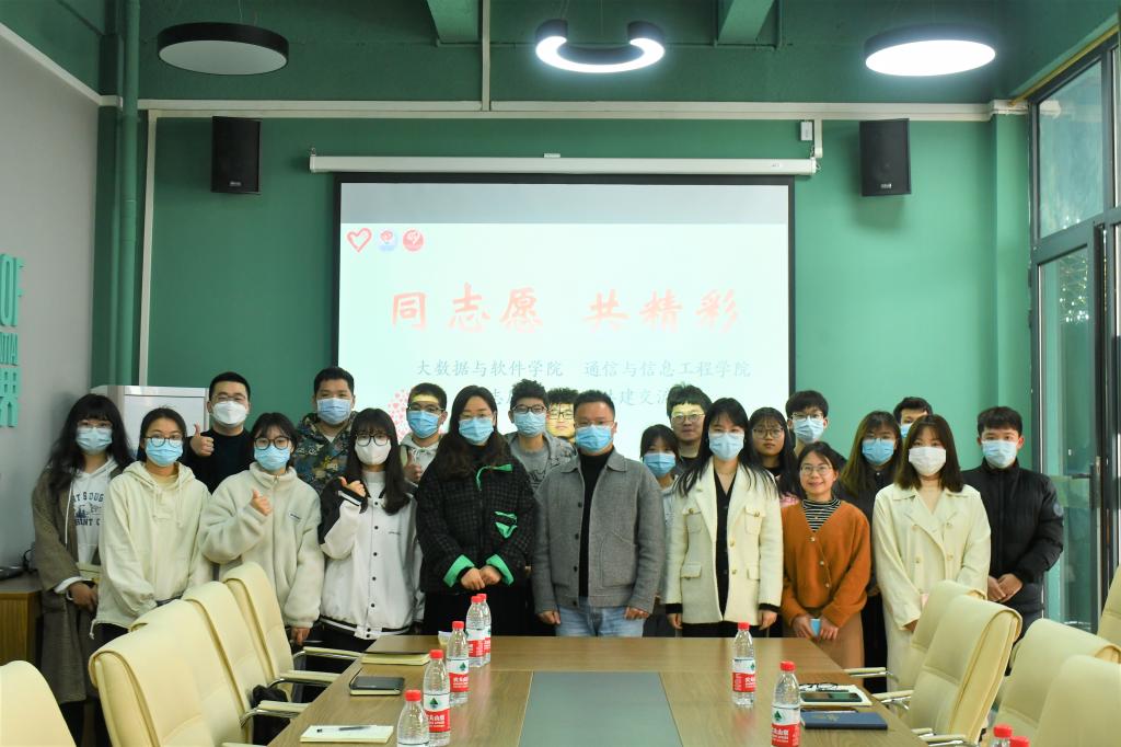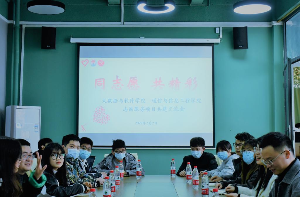 志愿服务源于心,奉献爱心始于行。为进一步促进志愿者服务组织之间的联动融合、志愿骨干间的沟通与交流,更好的开展志愿者服务活动,促进我校志愿服务深入发展。大数据与软件学院、通信与信息工程学院青年志愿者协会于2022年3月2日下午15:00在花果书院201开展以“同志愿,共精彩”为主题的志愿服务项目共建交流会。莅临本次交流会的有大数据与软件学院副院长王焱老师、志愿服务指导老师石静志老师,通信与信息工程学院副院长何燕老师,通信与信息工程学院指导老师苟凡铖老师、王艺老师。