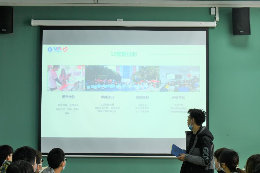 活动伊始,为增进项目了解,大数据与软件学院青协主席刘演军同学从项目背景、内容、运营管理、项目成果四个方面介绍了大数据与软件学院青协历年来在三江红丝带艾滋病防治宣教项目、三江绿丝带禁毒宣教志愿服务项目上的努力和优秀成绩,让通信与信息工程学院青协的老师和同学们对两大志愿服务项目有一个初步的认识和了解。