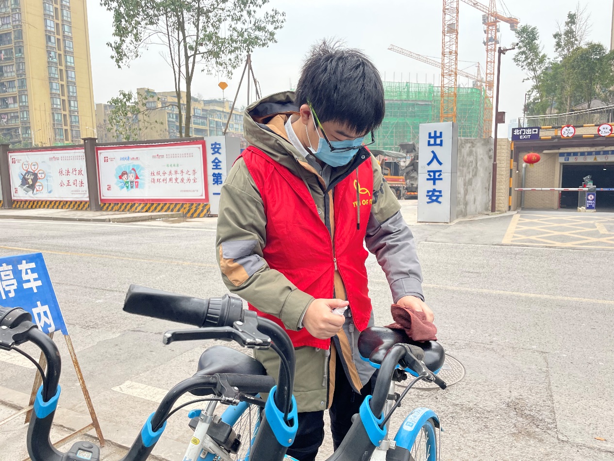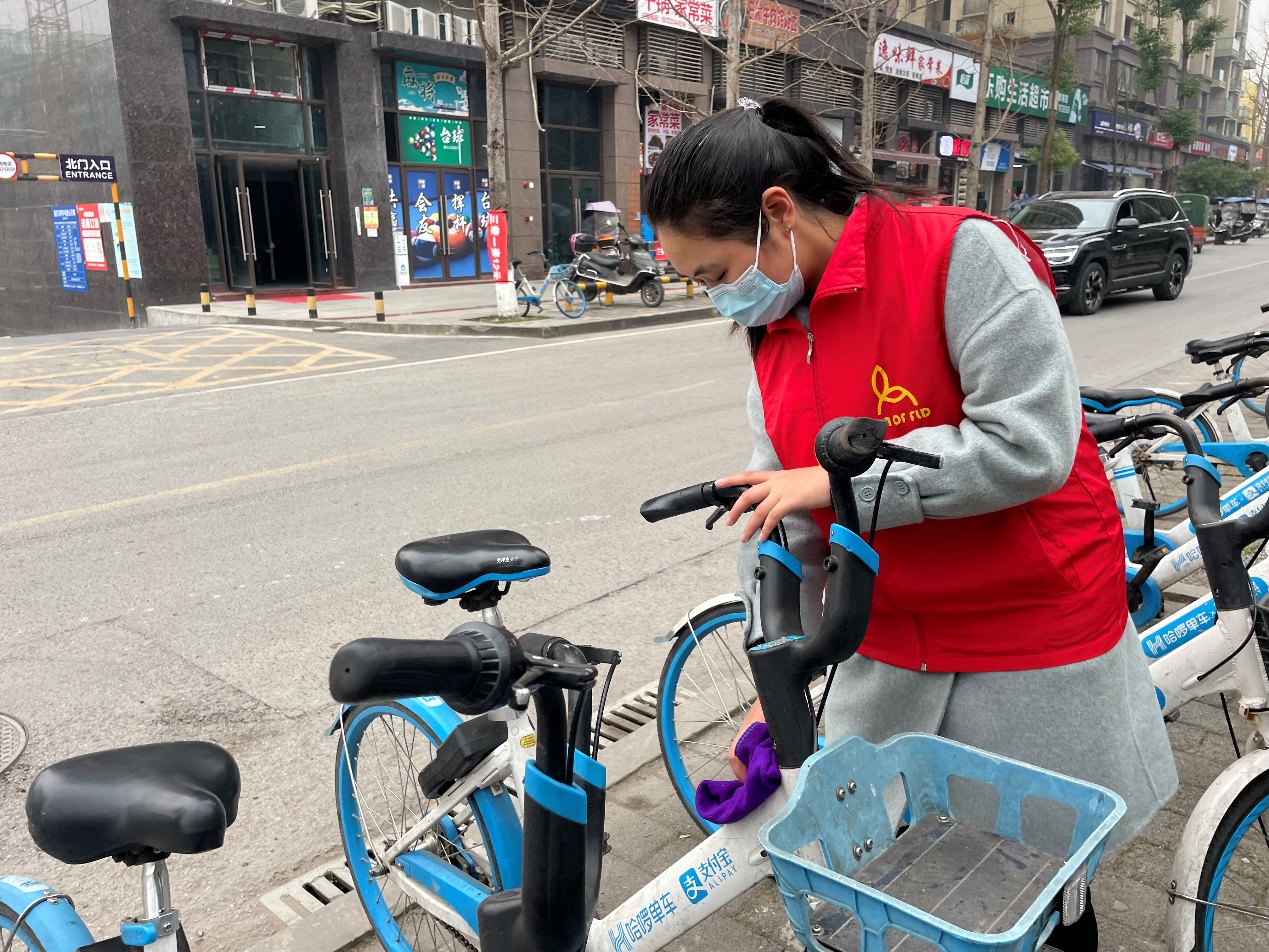 不仅如此,志愿者们还拿出提前准备好的湿抹布,对有明显污点斑迹的共享单车进行擦拭,仔细地将共享单车的车身、车锁、底板进行清洁,让原本脏乱的共享单车,重现清新蓝色。志愿者们响应疫情防控,带上酒精喷液,在擦拭单车的过程中,也为其消毒,减少病毒的传播。大家有序进行着此次志愿活动,虽然校外自行车道数量多,志愿工作任务量也不小,但大家仍然不怕苦、不喊累,共同整理单车,将车道环境变得更加整洁。此次志愿服务的工作也有利于深化志愿者们的价值观念,巩固和增强社会责任感,培养高尚的道德情操,让大家为社会环境发展献出自己的绵薄之力。