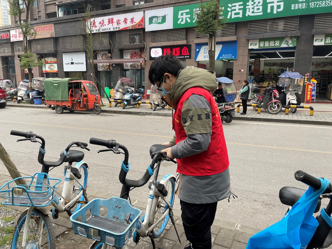 在疫情防控的情况之下,大家戴好口罩,到达学校附近的自行车道,将歪倒的共享单车扶正,并且停放到指定区域,摆放整齐。同时,对正在使用或停车的使用者进行引导。通过志愿者的引导,不少使用者都能将共享单车停放到指定区域,在一定程度上不仅方便了来往车