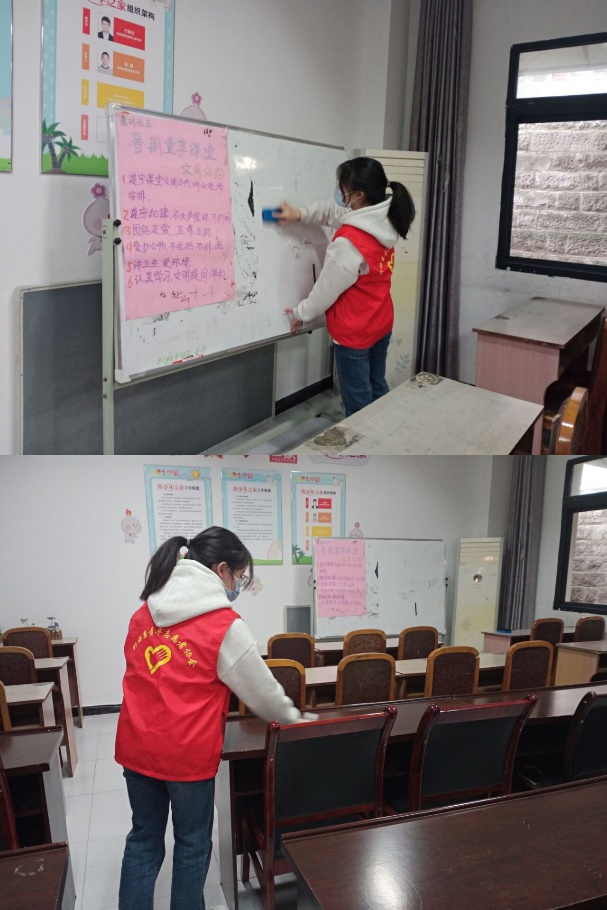 三月四日, 阳光明媚,志愿者们怀揣着对新学期满满的期望提前来到了濮湖社区。到了社区,大家主动拿起了清洁工具,团结协作着开始了清洁工作,他们拿起扫把,扫走灰尘,扫去过去一年的不愉快;拾起垃圾,让坏心情随着垃圾丢进垃圾桶;挥舞手中的拖把,把这小小一方天地变得明亮干净。他们看着这一方天地,不禁畅想以后与孩子们会在这里发生些什么故事。