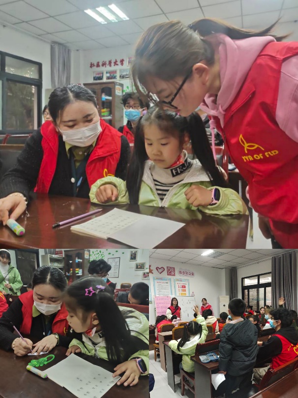 这学期教学内容与上学期基本无差,仍旧贯彻国家规定的“双减”政策,以上午书法小课堂和下午各种形式的趣味课堂为主。上课时间还没到,就已经有小朋友陆续来到了教室,他们的面孔或熟悉或不熟悉,但脸上无一例外都挂着幸福洋溢的笑容。在课堂开始,两位书法小老师先做了简单的自我介绍,然后再通过击鼓传花对小朋友们有了一个初步的了解。之后就开始了这学期的第一次书法教学,他们帮助小朋友纠正坐姿,教给孩子们正确的书写笔画。此外,还有蒙眼作画这样的趣味小游戏,提升孩子们的课堂积极性。志愿者们也在认真履行自己的责任,尽心辅导孩子们,朱老师更是尽心尽责,在小朋友练习写字的时候,会仔细叮嘱小朋友写正确的笔画,告诉小朋友在练字时一定要注意使用正确坐姿。这次课堂结束后,相信孩子们一定能够收获满满。