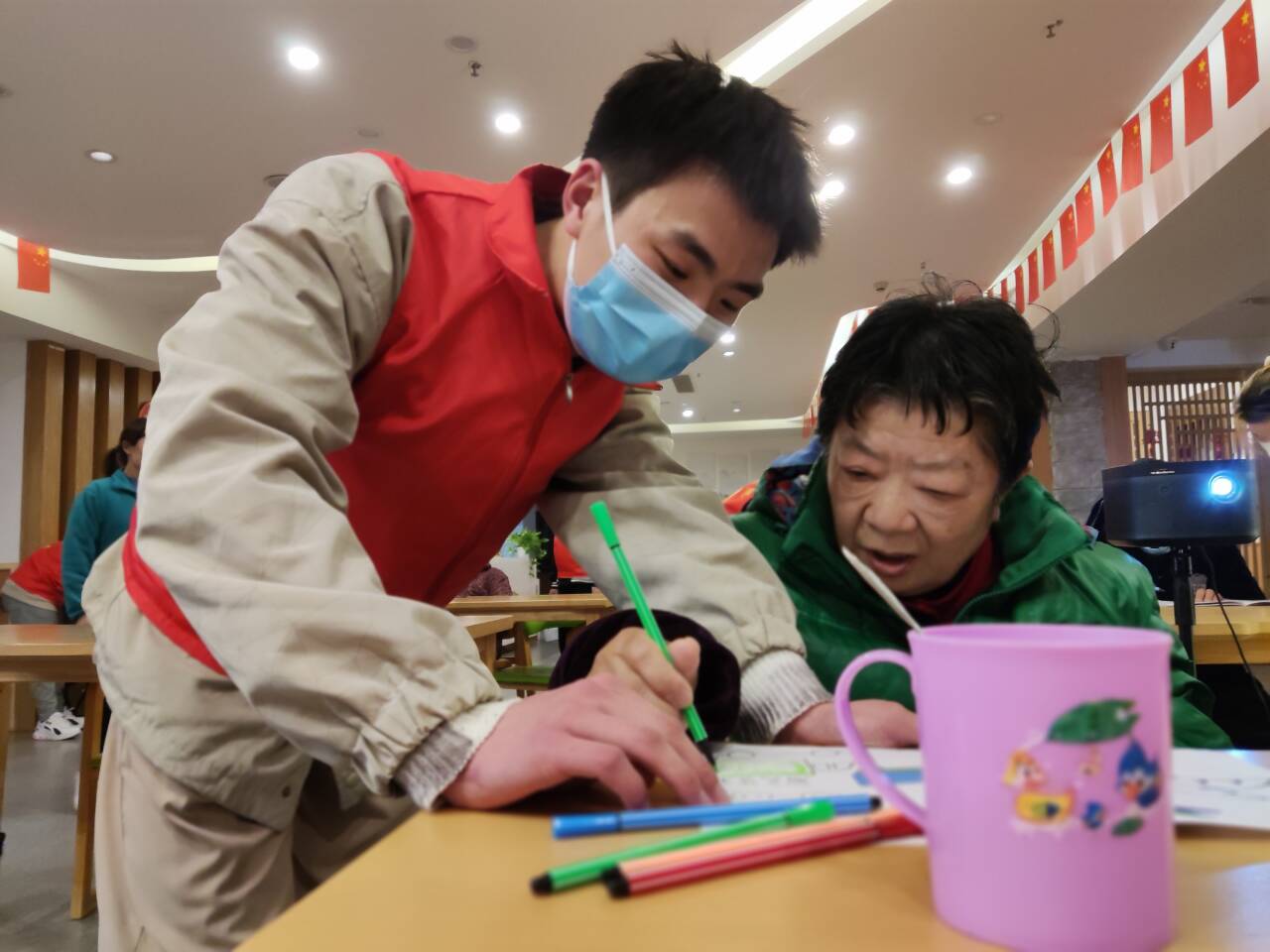 为帮助空巢老人缓解心中的寂寞情绪,“给图上色”游戏也顺利拉开帷幕。志愿者在和老人聊天的同时,耐心地教老人们给图画上色,在此过程中,倾听老人们流露的心声,对老人们进行鼓励和帮助。世界多姿多彩,“给图上色”也寓意着让老人们的世界更加缤纷绚烂。