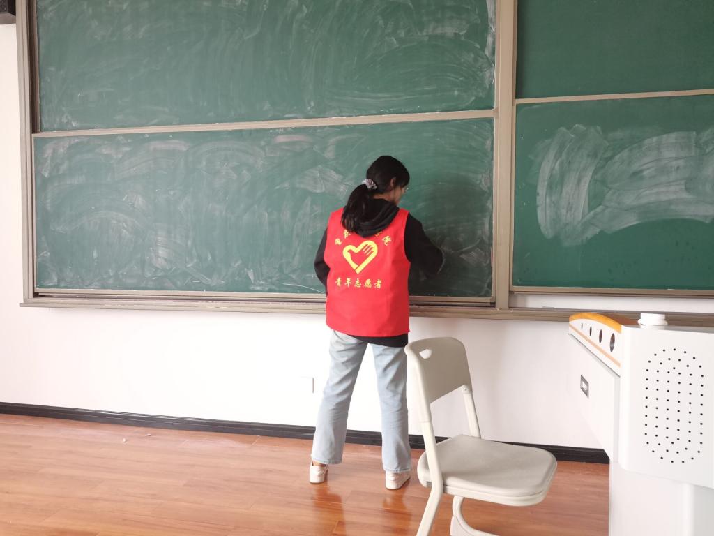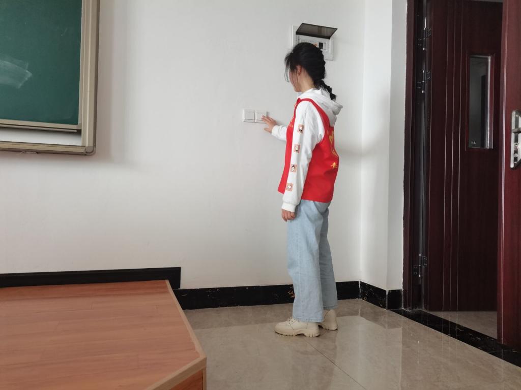为保证清洁工作落到实处,“绿色指尖”低碳节能支队志愿者一一排查每一个教室,将上完课后未能及时关掉的电灯关掉电源,未能及时擦拭的黑板进行擦拭,用行动发挥出志愿者的服务精神让同学们拥有一个良好学习环境。2021年习近平主席在考察广西时提到“以英雄模范人物为榜样”,希望同学们能够以志愿服务精神、节能低碳精神为榜样,为创造更好的校园环境努力前行。