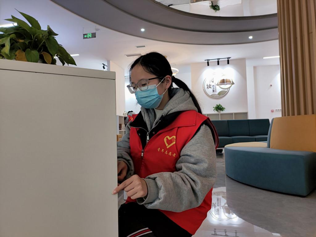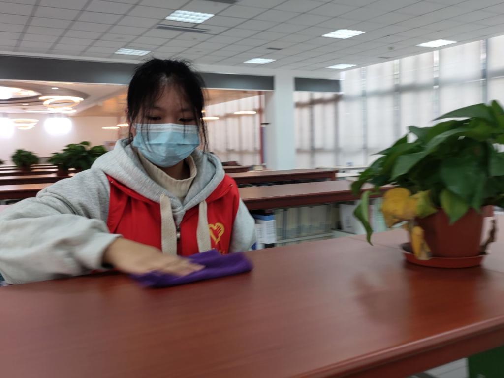 志愿者们轻声细语,不仅将书架擦拭得一层不染,杂乱的图书也在志愿者们的帮助下焕然一新。无论是沉积的灰尘还是遗落的纸屑,都被志愿者们打扫的一干二净,为在图书馆学习的同学们营造了良好的学习环境。