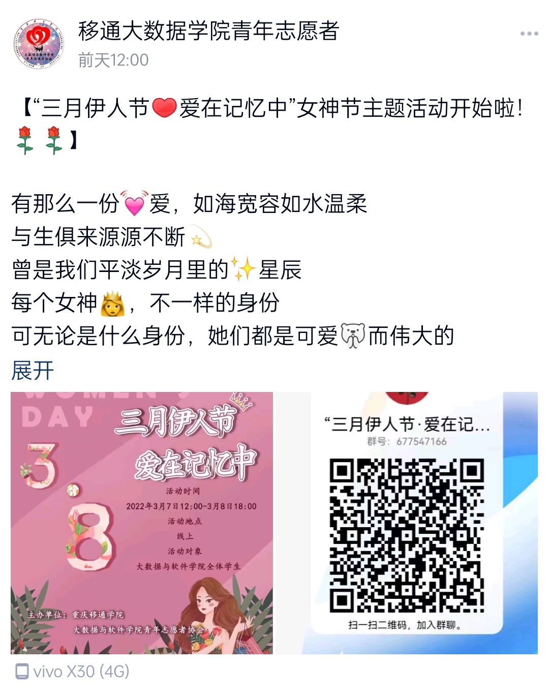 桃之夭夭,灼灼其华。人间三月,在鲜花盛开的季节,妇女们的节日也如期而至,在这个温柔美好的日子里,为表达对母亲的爱意、对老师的尊敬,让同学们学会感恩,尊重长辈,大数据与软件学院青年志愿者协会于2022年3月7日12:00-3月8日18:00开展以“三月伊人节·爱在记忆中”为主题的线上活动。
