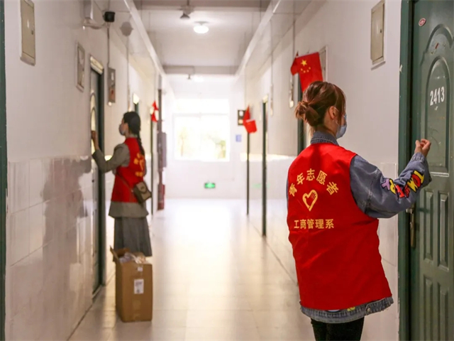 女生节当天,迎着朝阳,能发现南北校区各个角落都有一抹抹专属于淬炼·国际商学院的志愿红......