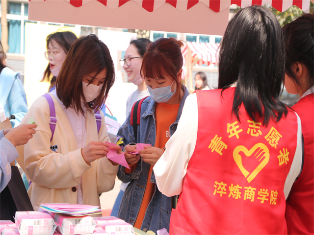 淬炼·国际商学院SHE关爱女性志愿服务专项支队在黄桷树广场(合川校区)和图书馆广场(綦江校区)打造两条粉色长廊,为全校女性师生送上2万包卫生巾,活动现场,不少师生驻足打卡,参与互动,尽显“她”魅力。
