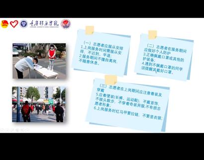 本次志愿者培训会主要是从目前的疫情状况、防疫志愿工作的内容、防疫工作中的注意事项等多角度出发。作为防疫志愿者,首先自己要具有丰富的防疫知识,主讲者刘演军讲到:“身为志愿者,我们要以身试责,认真落实相关防疫要求,督促好同学们佩戴口罩情况,劝谏同学们保持一米的安全距离等。”通过主讲者刘演军的讲述,志愿者们明白了自己的工作内容和相关防疫要求。