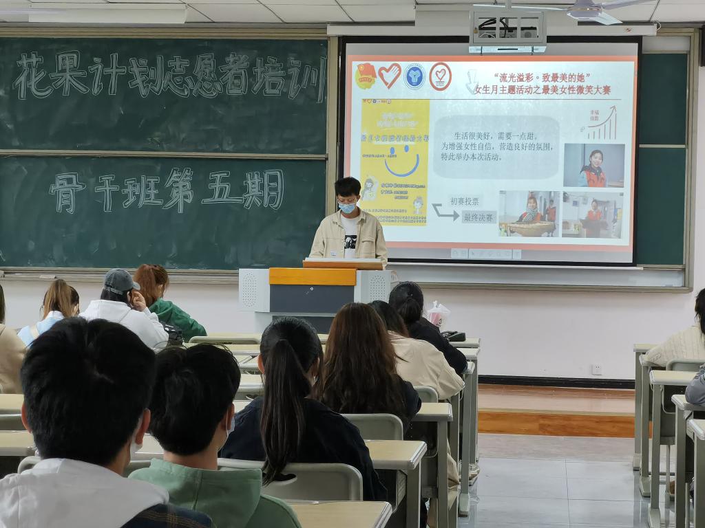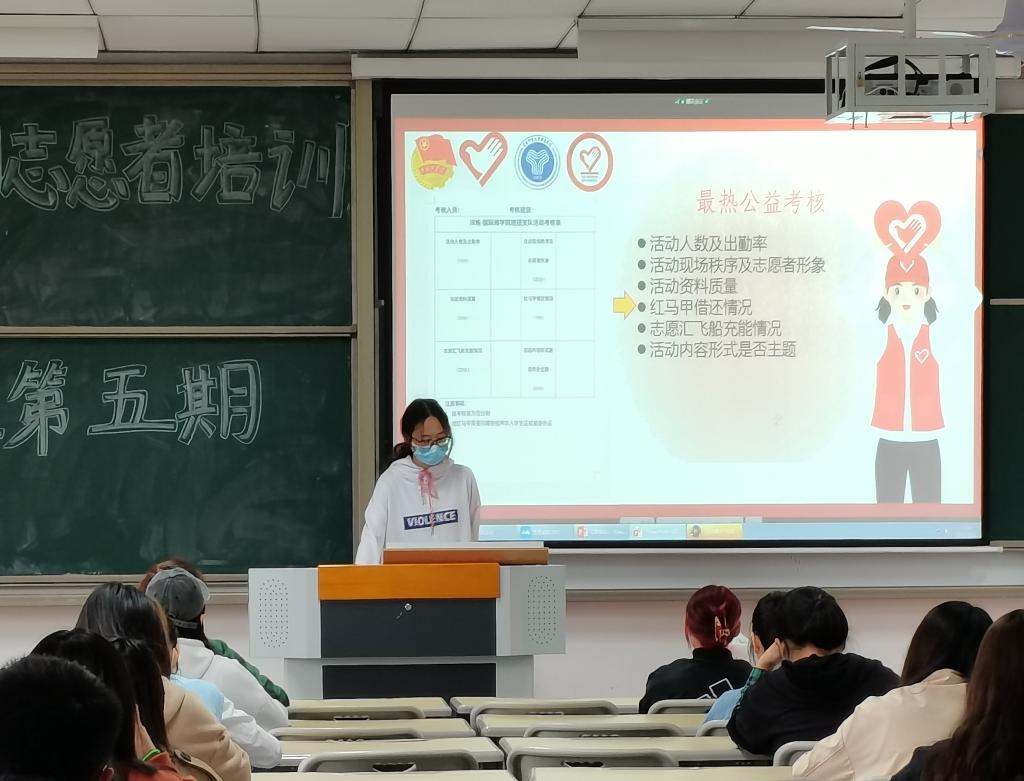 志愿诉说春风三月。培训中期,杨星元继续对学院三月的志愿服务活动进行了现场解读:“弘扬雷锋志愿精神·共创和谐美好社会”的走进登瀛学校的志愿服务活动;以“一路生花·集祝福送女神”为主题的女生节特别活动;“致女性·不被定义的力量”健康知识讲座;“予她同行,‘卫’她解忧”免费卫生巾发放活动;“最美女性微笑”摄影大赛。杨星元表示,在为他人服务的同时,自己也从中汲取到很多的经验,学习到有效的服务技巧,甚是感动。在每一场志愿服务活动中,最亮眼的就是那一抹红和那一个个忙碌的身影,这不仅展示了志愿者的风采,更体现了志愿者的担当。看到这些志愿服务活动,大家纷纷赞叹,并立志以后要加入志愿服务行列。