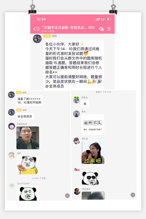 活动伊始,参赛者们在竞赛群中便展开激烈讨论,纷纷分享自己熟知的骗局和诈骗手法,其中包括但不限于刷单返利,中奖短信,转账电话等。通过本次分享帮助学生们增强自身对电信诈骗的认识和预防。