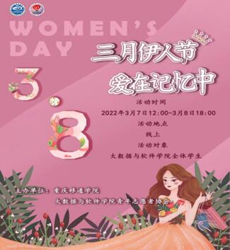 桃之夭夭,灼灼其华。人间三月,在鲜花盛开的季节,妇女们的节日也如期而至,在这个温柔美好的日子里,为表达对母亲的爱意、对老师的尊敬,让同学们学会感恩,尊重长辈,大数据与软件学院青年志愿者协会于2022年3月7日12:00-3月8日18:00开展以“三月伊人节·爱在记忆中”为主题的线上活动。