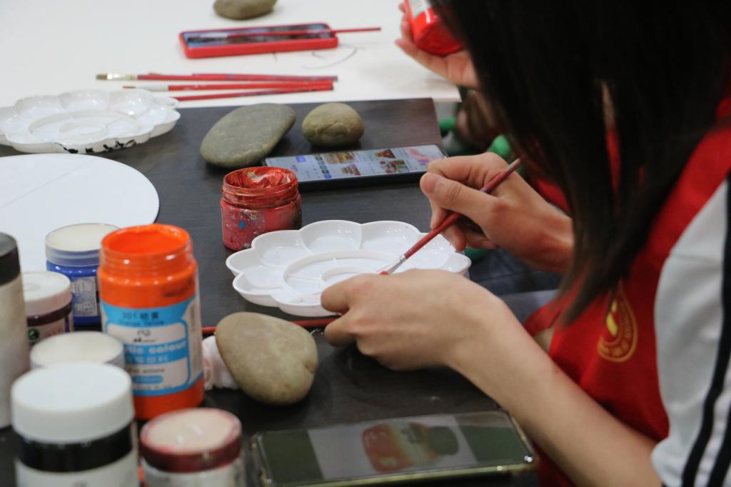 这期活动与往常有些许不同,夜幕将至,学生社团活动中心室却灯光通明,九名志愿者围靠在桌前,手持画笔,在一块块手掌般大小的石头上绘制着歌颂祖国的红色图案。在大家心目中,虽然关于祖国美的方面各有不同,但每个人无不充满敬意,有的志愿者描摹的是红船,有的志愿者刻印的是国旗党旗,以中国红为主的颜色就是志愿者们眼中最美丽的颜色。