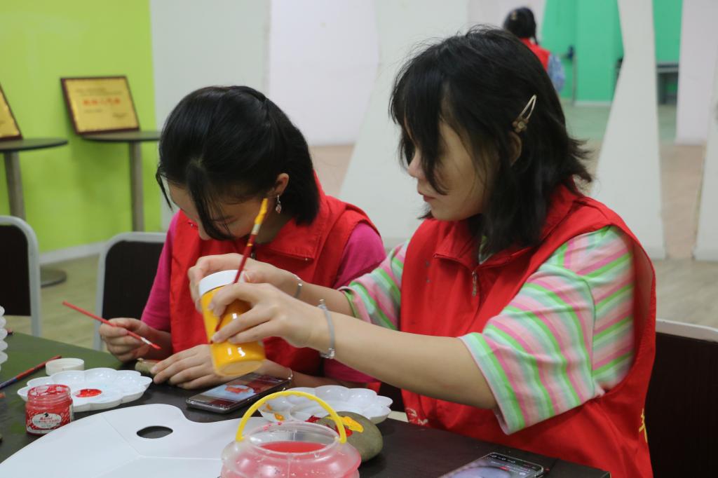 在志愿者们的精心描绘下,为单调的石头增添了一抹抹红色基因,不同石头上呈现的是不同的中国故事,饱含着强烈的情感与力量。志愿者们用小笔缓缓地,仔细地在石头上描出一笔又一笔。对国家的热爱,对党的忠诚,仿佛回荡在他们眼中的是1922年5月5日那一天,一群经受“五四运动”洗礼的中国共产主义者集结在一起,在中国共产党人张太雷同志从莫斯科带回了青年共产国际关于建立中国青年团组织的指示,中共中央局随即决定由张太雷等人主持正式建立青年团的工作,中国共青团由此建立起来。在中国共产党的领导下,中国共青团组织在动荡不安的年代逐渐发展起来。