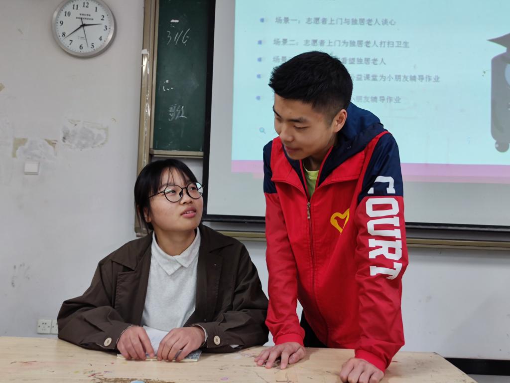 嘉宾老师与部分支队员通过志愿服务情景模拟的形式,让各支队能够更好地认知到自身在志愿服务活动中的不足之处,从而提高其支队志愿服务工作的专业性。五只支队分别模拟与独居老人谈心、为独居老人打扫卫生、看望独居老人、在公益课堂为小朋友辅导功课、上门为小朋友辅导作业等五个情景。