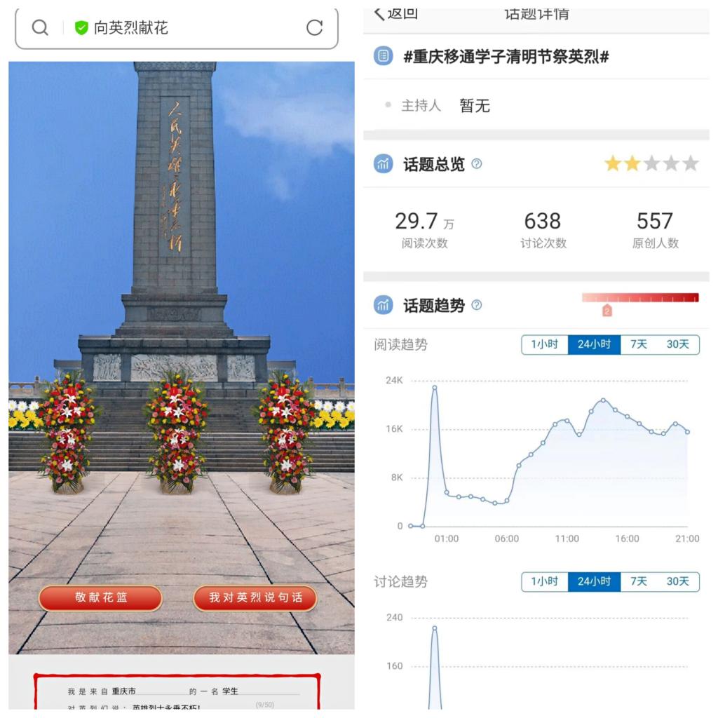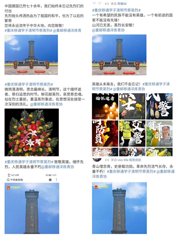 春光正好清明时,柳絮青冢寄哀思。2022年4月5日,淬炼青协和老兵支队借助微博超话等网络平台开展了线上扫墓活动,组织移通学子积极参与网上祭扫活动,并把对烈士的寄语上传到网络平台,活动反响热烈。此次活动进一步激发了广大青年学子的责任感和使命感,激励大家铭记历史,以实际行动传承英烈精神,增强民族文化的认同感和归属感。