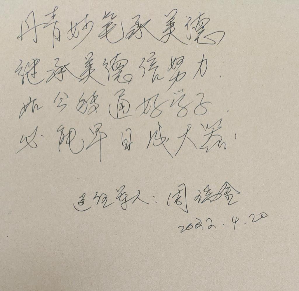 退伍军人周瑞金爷爷讲述了自己的亲身经历,并鼓励当代大学生一定要奋发图强,为祖国贡献出属于自己的力量。交流互动接近尾声,周瑞金爷爷书写墨迹赠予移通学子,只见他提笔一挥,下笔刚劲有力,行云流水般写下一首祝福诗:“丹青妙笔承美德,继承美德信努力。如今移通好学子,必能早日成大器。”引得红马甲们掌声连连。周瑞金爷爷讲解的红色历史故事大大激发了同学们学史明理、学史增信、学史崇德、学史力行的动力,同学们纷纷表示要争做“德、智、体、美、劳”全面发展的社会主义接班人。
