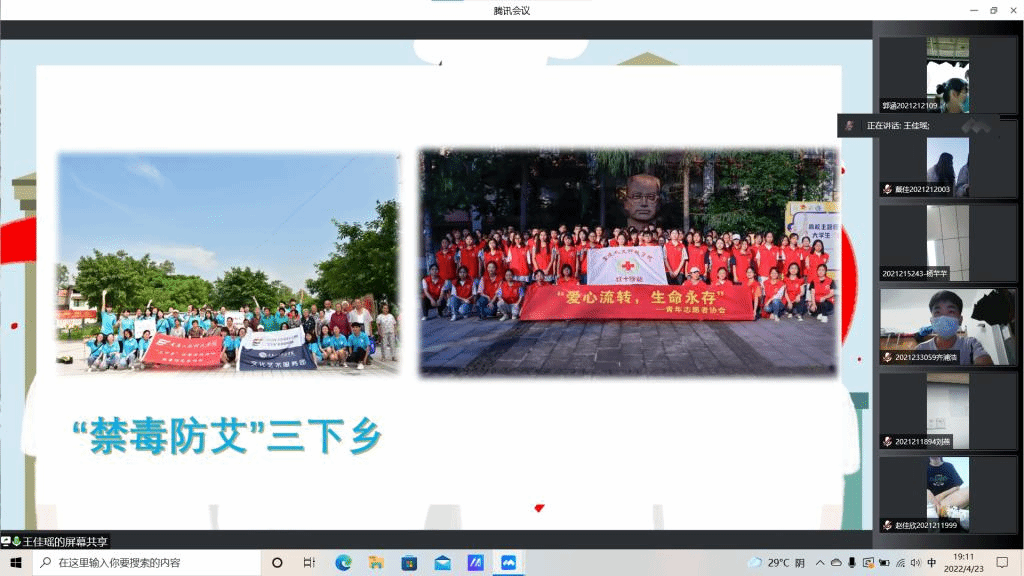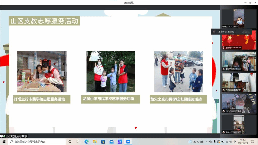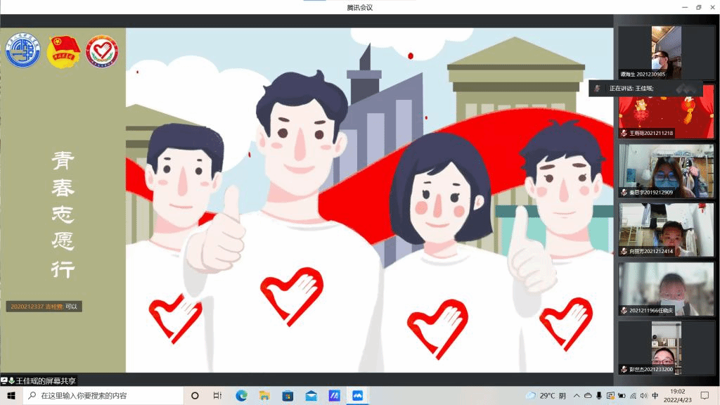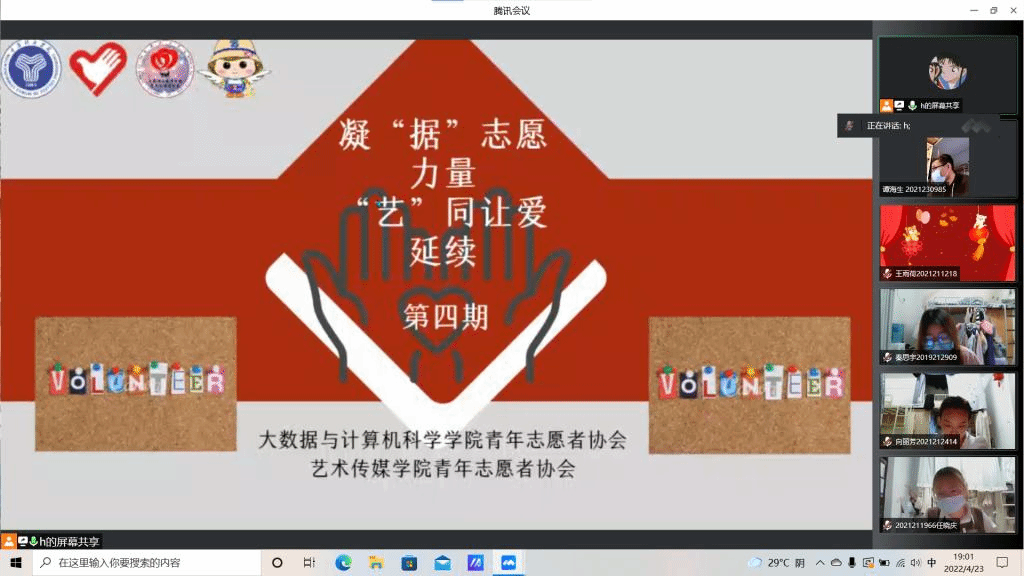 为使志愿者更深层次的认识到志愿服务活动的意义,践行“奉献、友爱、互助、进步”的志愿者精神。2022年4月23日晚19:00,大数据与计算机科学学院与艺术传媒学院青年志愿者协会采取线上会议的方式在腾讯会议上开展了凝“据”志愿力量·“艺”同让爱延续分享会第四期。本次分享会邀请的主讲嘉宾是刘玲燕学姐,让刘玲燕学姐带我们再次领略志愿服务活动的风采吧!