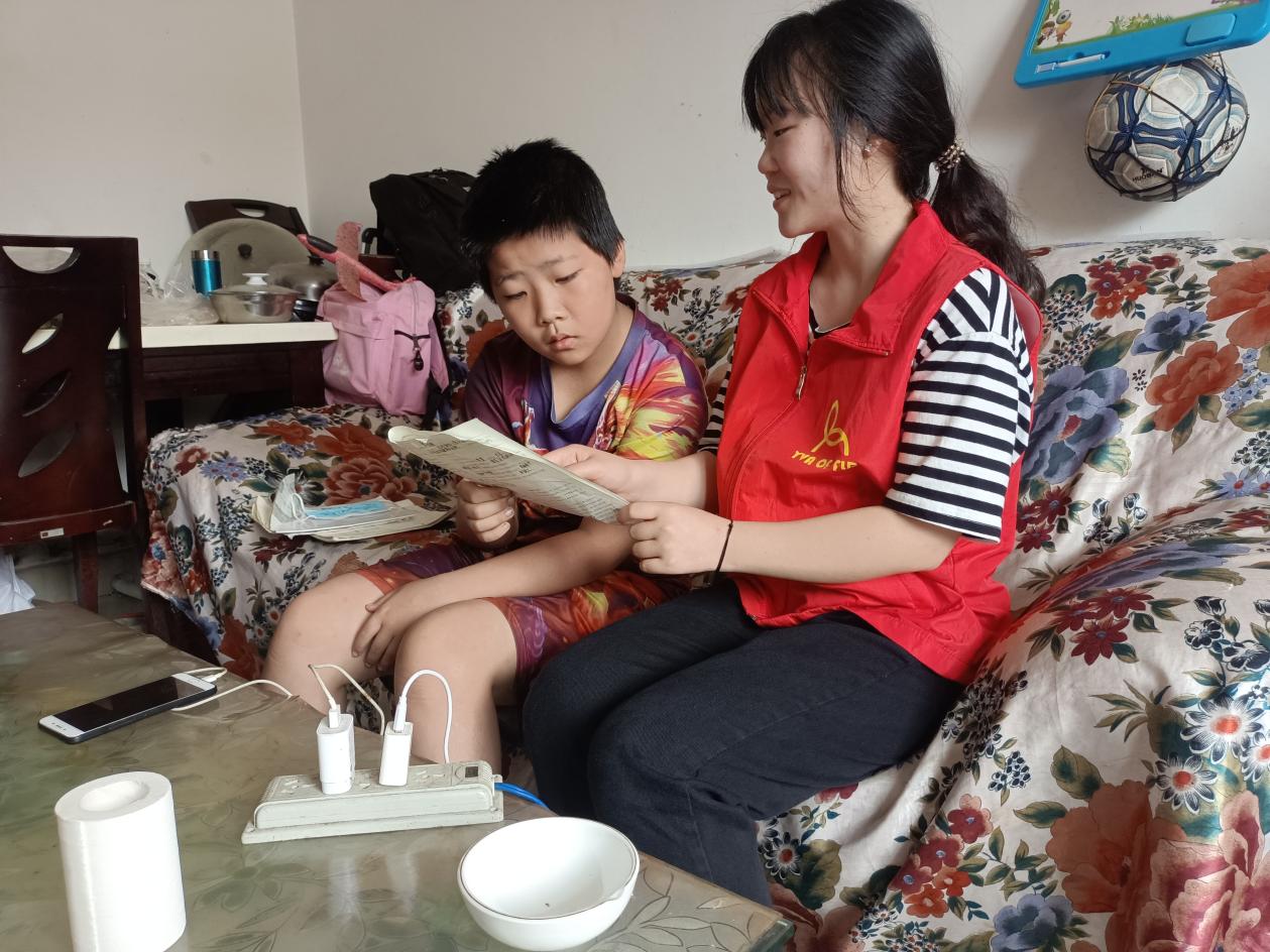 短暂的交流,又到了回归正题的时候——检查小熙的周末作业。当小熙拿出自己的语文试卷和作文时,不看还好,看了令志愿者们的头有些许疼。因为存在很多的错别字,志愿者拿出红笔耐心的划出错别字。接着,小熙一个一个的修改,因为太多的错别字小熙有点不好意思,志愿者拍拍他的肩膀,说没事的,平时要多看字典,牢记易错的字。数学是他的强项,拿出数学试卷,志愿者和小熙一起讨论有关物体体积、表面积的知识,帮助小熙回忆之前学的内容。复习很重要,大家不能忽视。