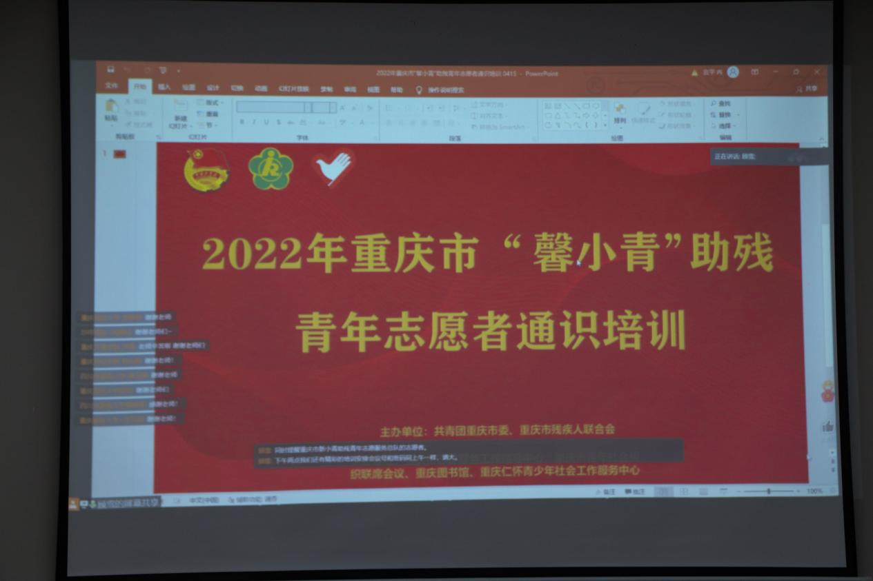 我校作为“2022 年重庆市‘馨小青’助残青年志愿者高校试点之一,为深入学习贯彻习近平总书记关于青年工作的重要思想和关于残障人士事业的重要指示批示精神,进一步引导广大青年志愿者自觉践行社会主义核心价值观,积极参与助残志愿服务;为残疾青少年群体办实事、做好事、解难事,努力营造"人人扶残助残、促进社会和谐”的氛围,进一步推动助残“阳光行动”落地落实,全面提升“馨小青”助残青年志愿者的专业能力,贴合移通完满教育育人理念,让我校志愿服务更加专业化、规范化、品牌化发展。4月17日、4月23日上午,由团市委、市残联共同举办“2022 年重庆市‘馨小青’助残青年志愿者线上通识培训”。