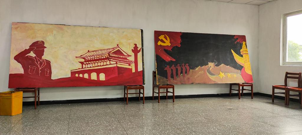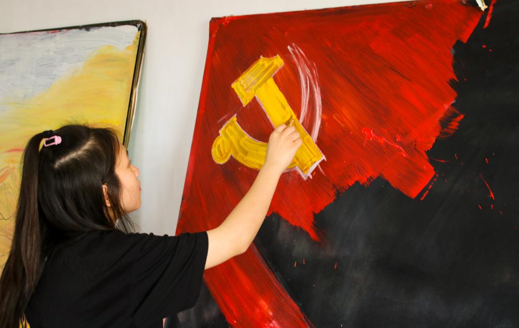 志愿者们用一抹抹柔和的线条渲染出耀眼而又深沉的国旗,国旗下则通过锐利的线条表现出落霞为伴,目光如炬战士们坚毅的身影,整齐划一,蓄势待发,他们臂膀上的徽章发出夺目的光亮,火红的军徽里印刻了战士们的忠贞。画笔下的火红是战士们用血肉和生命换取一轮明月和朗朗清风,是亘古不变的军魂。