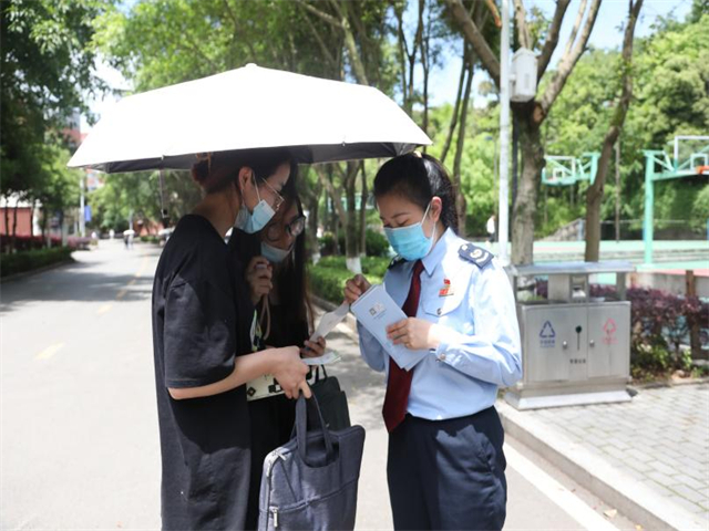 合川区税务局的税务员则拿着手册,向周围产生疑惑的同学解答,普及税收法治知识,带领他们领略我们身边的税法。尽管烈日炎炎,但他们仍孜孜不倦,向每一位移通学子普及税法知识,微笑成了他们的标签,爱在校园蔓延。